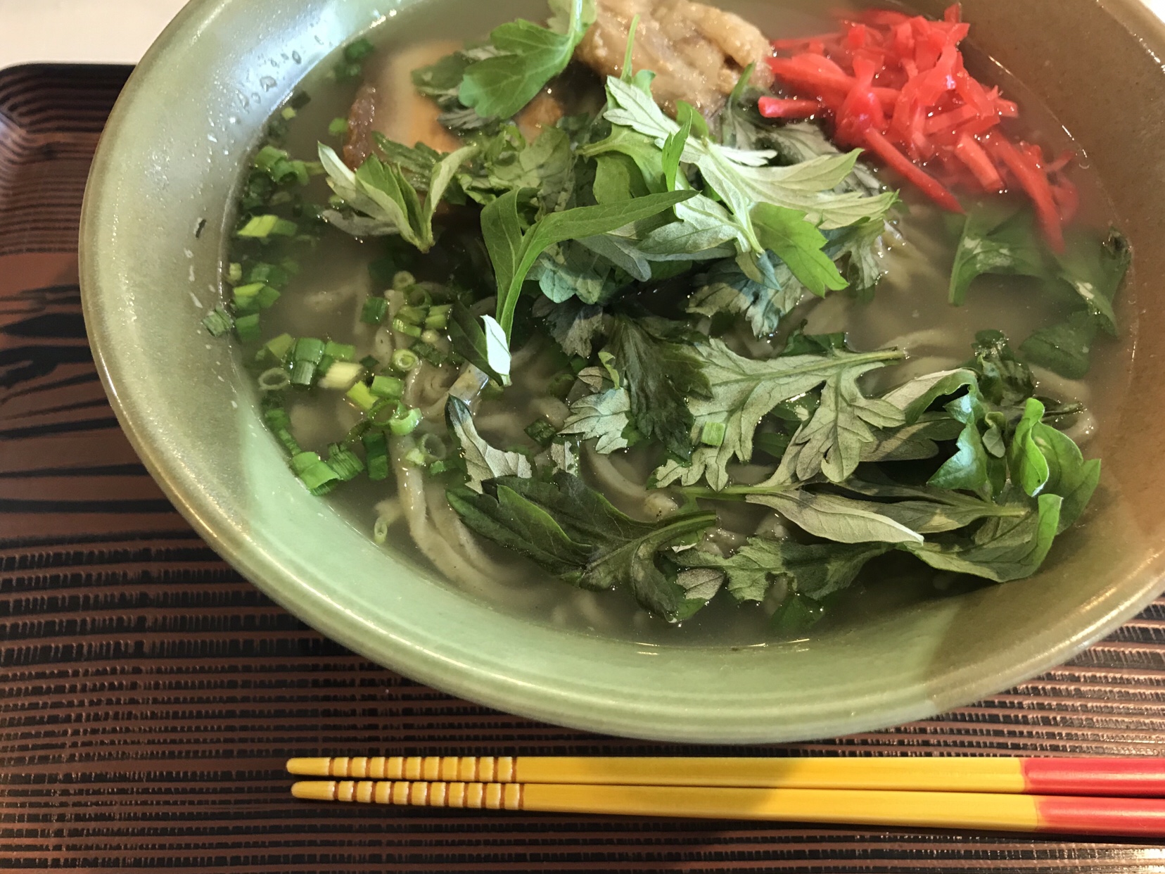 This is soba served with local herb called “yomogi (mugwort)”. Yomogi has a distinctive aroma with bitter flavor, often used as ingredients for various food such as mochi rice cake or steamed buns.
