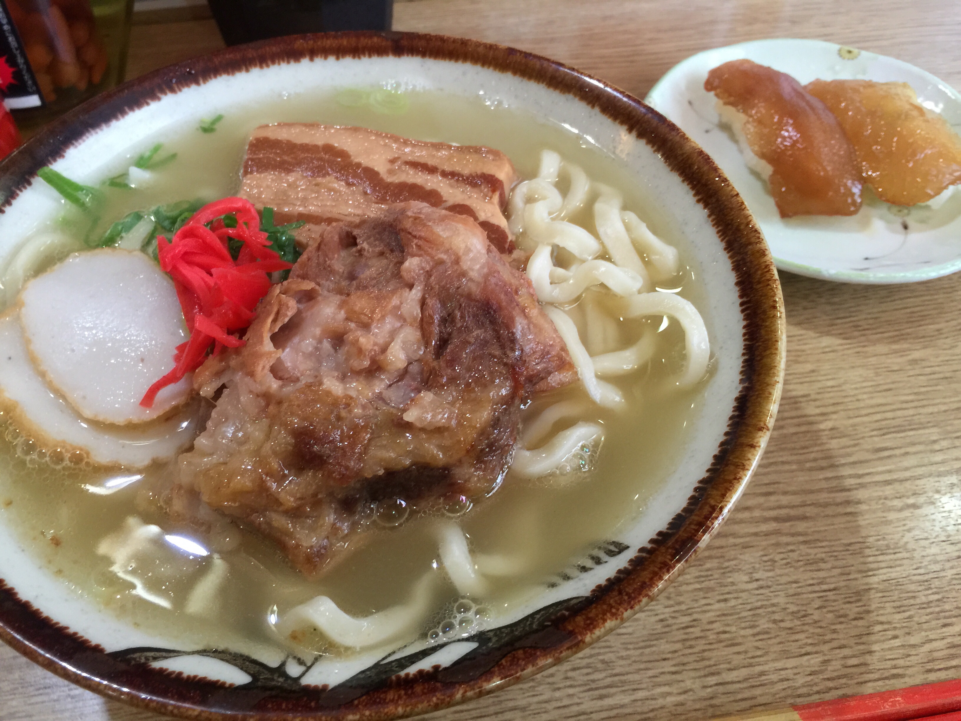 The style is different at each shop or region. This is Okinawa soba served at “Daito Soba”. An bowl of noodle comes with nigiri-sushi.