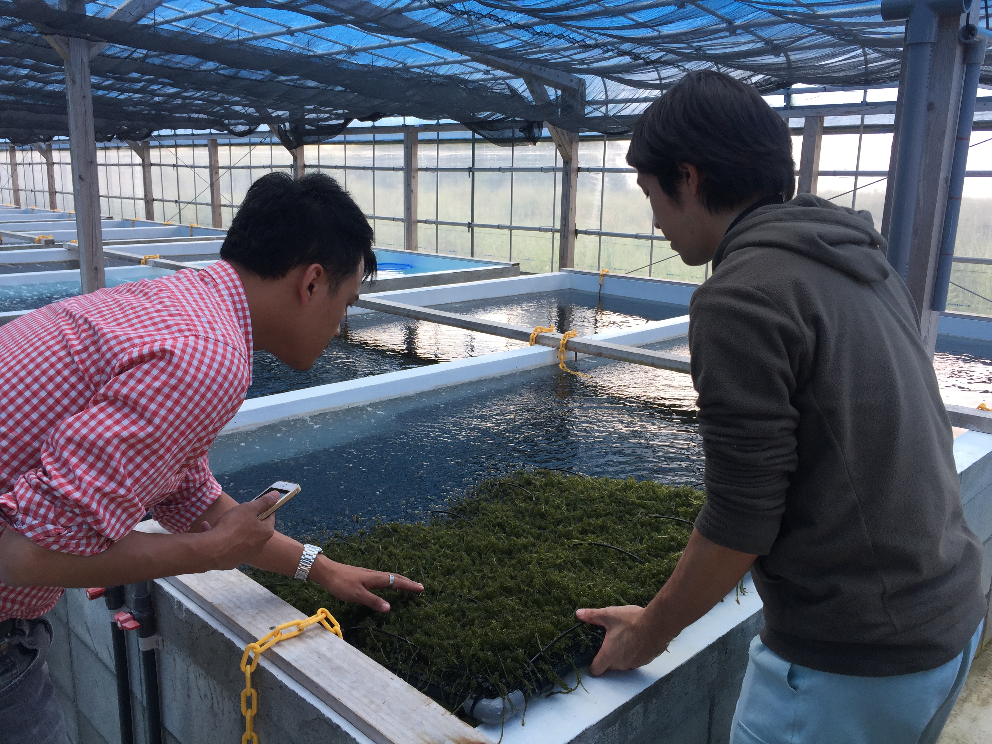 My client checking each containing sea plants in sea water which is drawn from nearby beach.